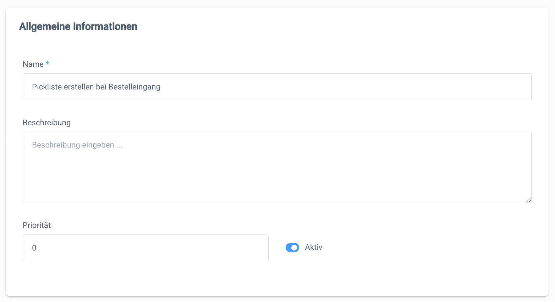 | Öffne den Flowbuilder unter Einstellungen → Shop → Flow Builder und klicke dort auf Flow hinzufügen. In unserem Fall erstellen wir einen Flow, der dafür sorgt, dass bei Bestelleingang eine Pickliste für die Bestellung erzeugt wird. Vergib zunächst einen Namen und stelle sicher, dass der Flow aktiviert ist. | |