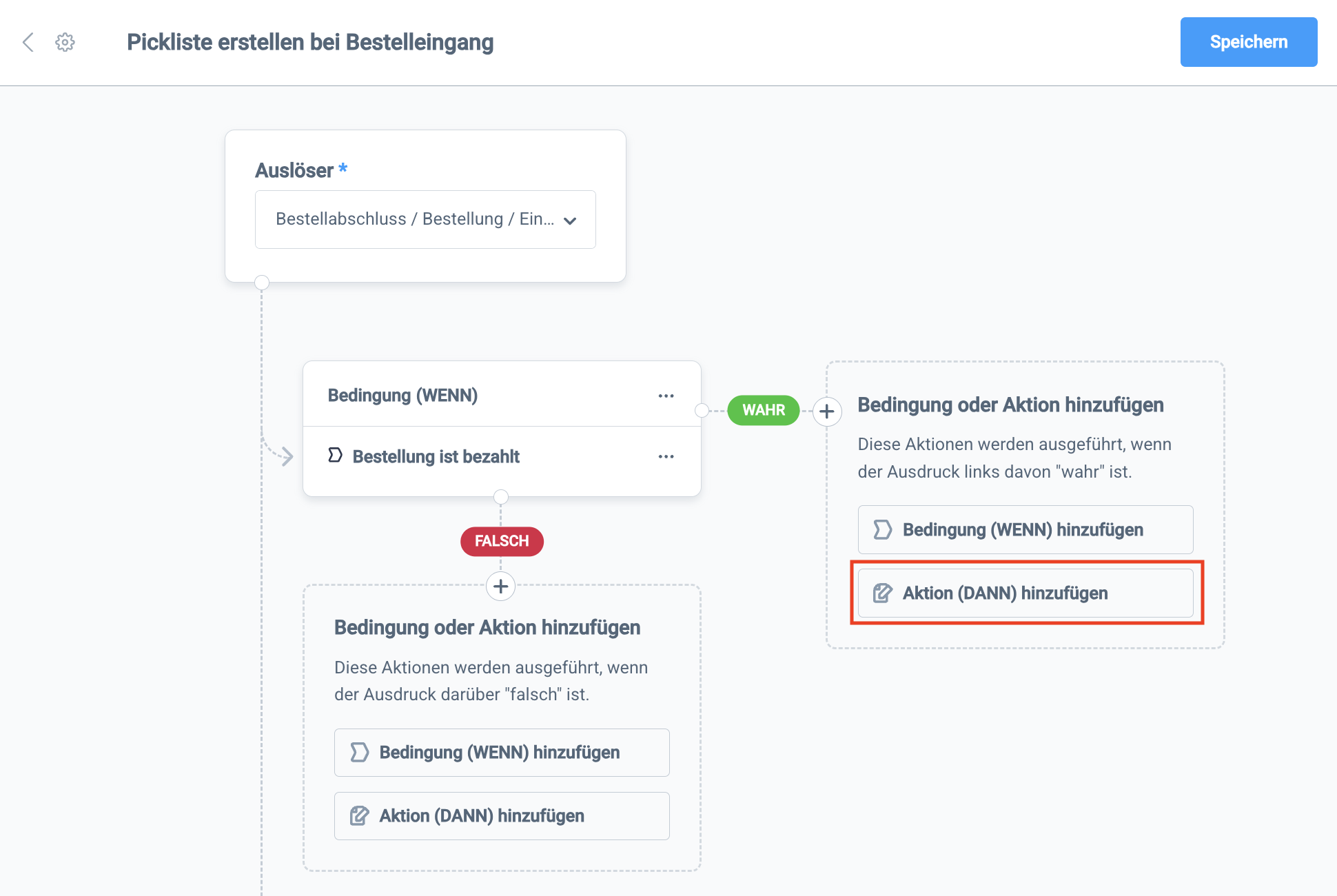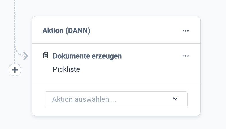 | Wähle hier die Aktion Allgemein → Dokument erzeugen → Pickliste aus. Speichere dann deinen Flow. | |
